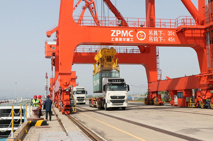 春陽高照,江天一色。一臺巨大的岸邊橋式起重機緩緩將一個個集裝箱從停靠在江邊的力洲國際貨輪上吊起,穩(wěn)穩(wěn)放在停在碼頭棧橋上的轉(zhuǎn)運車上。一輛車開走駛向貨場,下一輛迅即補位。