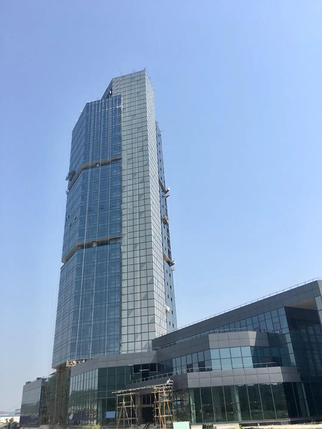 在高99米、建筑層數(shù)25層的宜昌高新區(qū)白洋港口新區(qū)地標項目——三峽航運大廈大樓上,27名身系安全繩的工人正在16層、19層吊籃上安裝玻璃幕墻。